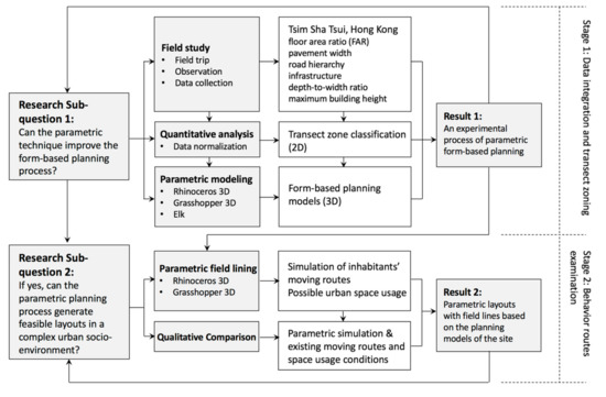 The methodology framework consists of two stages (Figure 1). The first stage comprises data integration and transect zoning. Methods include field study, quantitative analysis, and parametric modeling. These work to answer the research sub-question 1: Can the parametric technique improve the form-based planning process? The second stage examines travel behavior and routes. The methods include parametric field lining and qualitative comparison. They contribute to answering the research sub-question 2: If the parametric technique can improve the form-based planning process, can the parametric planning process generate feasible layouts in a complex urban socio-environment?