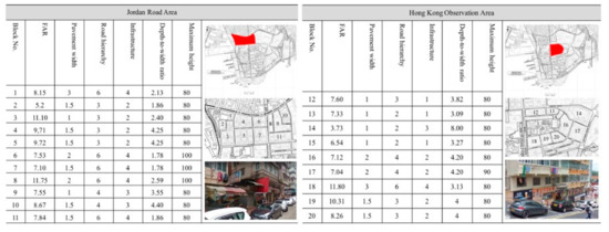 Given the scale of the study site and the density of the urban environment, this paper chooses six form-related data types to generally describe the existing form conditions of Tsim Sha Tsui. These are: floor area ratio (FAR), pavement width, road hierarchy, infrastructure, depth-to-width ratio, and maximum building height. During the field investigation, a table recording the values of each data type was compiled for each block in Tsim Sha Tsui, as indicated by Figure 2. The site comprises sixty blocks; twenty are included here as examples.