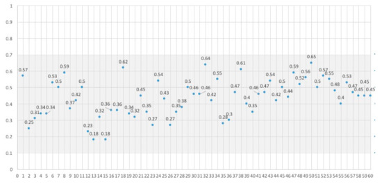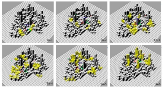 According to Duang, the zones of a standard transect matrix are named from Transect1 (T1) to Transect6 (T6)—from natural to artificial. The higher the number value, the greater the artificial nature of a transect zone. T6, the urban core zone, represents the most artificial areas of a standard transect matrix. As a typical dense area, Tsim Sha Tsui belongs largely to T6. Inside the Tsim Sha Tsui area, more detailed transect zones are required. Accordingly, X values of all blocks are grouped with a certain tolerance. Considering the in-depth planning of the site, this paper sets the group tolerance as 0.1. Therefore, each X value belonging to the closed interval [0,1] is grouped within a certain range. For example, the X value of block No. 2 is 0.25 and block No. 12 is 0.23. They both belong to the range 0.2–0.3 so are grouped as one transect zone. This transect zone is named as T6-2. The name contains two parts. T6 indicates the study site generally has urban core zone features. The dash alongside a specific number indicates the zone is a subtype of T6. The number after the dash is named according to the first decimal number after the digit. Figure 4 demonstrates that all X values are calculated by Formula (2). The values cluster within the range 0.1–0.7. With a tolerance of 0.1, all X values are grouped into six equal value intervals. Arranging X by numerical values, each block belongs to one specific transect zone in the transect matrix of Tsim Sha Tsui. As Figure 4 illustrates, the transect zone of blocks 13 and 15 is T6-1 and the transect zone of blocks 2, 12, 23, 26, and 35 is T6-2. Blocks 3, 4, 5, 9, 14, 16, 17, 19, 20, 22, 27, 28, 36, and 40 are transect zone T6-3. Blocks 10, 21, 25, 30, 31, 33, 37, 39, 41, 42, 44, 46, 54,55, 57, 58, 59, and 60 are transect zone T6-4. The transect zone of blocks 1, 6, 7, 8, 11, 24, 29, 34, 43, 45, 47, 48, 49, 51, 52, 53, and 56 is T6-5. Those of blocks 18, 32, 38, 50 are T6-6. The artificial level of urban form generally becomes higher from T6-1 to T6-6.