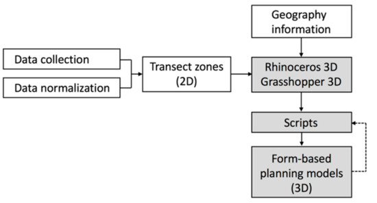 With the rise of form-based planning implementation in recent decades [14], multiple computational-aided techniques aid form-based planning projects. Compared to existing manual planning methods, computational-aided techniques result in relatively efficient planning processes and intensive databases—especially in complex urban situations. For instance, Kim and Clayton used building information modeling (BIM) tools to support form-based planning [15]. They proposed that the capabilities of an application programming interface that supports object-oriented programming results in a powerful environment for expressing planning and design concepts [15]. For the purpose of their study, variables such as road width and building size were defined as modeling parameters. These applied mostly to small-scale single buildings and blocks rather than to large-scale urban morphology. A surfeit of detailed constraints may create a confused database; one difficult to implement in real practice. BIM tools, as a result, seem unsuitable for form-based planning. CityEngine, a modeling tool for urban projects, is also tested in form-based planning [16]. Designers could use only the parameters and modules that are already set in CityEngine’s inner system because of the limited editing function provided by the interface. As a result, CityEngine proved too inflexible to control complex urban forms. This paper experimentally employs another parametric tool, Rhinoceros 3D (with its plug-in Grasshopper 3D), to pursue using parametric techniques to support form-based planning. The tool contains a visualized coding interface to create three-dimensional models and has worked on simulating the construction results of building projects for years. In this paper, Rhinoceros 3D and Grasshopper 3D help to examine the parametric techniques on an urban scale.