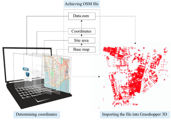The workflow of importing OSM data into Grasshopper 3D. Building information is obtained from OSM Online by setting site areas on the base map. Writing scripts in Grasshopper 3D, the building information is translated into parametric coordinates. These coordinate points work to process the parametric modeling in Grasshopper 3D.