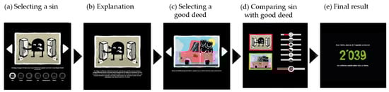 Simplified process for the Eco-Confessional: Users select an eco-sin (a) and receive information on the environmental impact of the selected sin (b). Afterwards, a good deed can be chosen (c) which is compared with the confessed eco-sin (d). Finally, the user will find out how many times the good deed needs to be performed to compensate for the eco-sin (e).