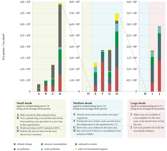 Total environmental impact of selected eco-sins assessed with the Ecological Scarcity Method (logarithmic scale) and exemplary ‘good deeds’, and how many times they have to be repeated in order to compensate for the eco-sins.