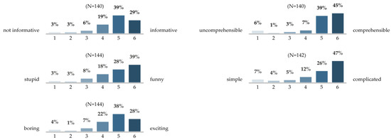 The principle aim of the Eco-Confessional was to present the topic of sustainability in a playful way to a non-environmentally-oriented audience. The visit to the Eco-Confessional was intended to be entertaining and fun. Visitors rated the Eco-Confessional positively, and a clear majority regarded the experience as educational, understandable, funny and exciting (Figure 7). This positive impression was also confirmed by the fact that 75% of the visitors would recommend a visit to others.