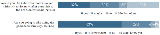 A visit to the Eco-Confessional resulted in an increased interest in the topic. While 32% of respondents had already dealt with this topic on several occasions, 32% said they would like to focus on it even more in the future, and 30% may want to do so (Figure 8). Besides raising awareness and interest, and providing new information, an important goal of the Eco-Confessional was to help visitors adopt a more environmentally friendly lifestyle. Of the visitors who participated in the survey, 62% planned to perform the chosen good deed, and 29% planned to do so at least partially (Figure 8).