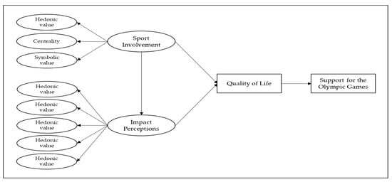 Within the structural model of support for the Olympic Games, the association of sport involvement with QoL positively influences support for the Olympic Games. Residents who have both a high QoL and high sport involvement are more likely to support the Games as a multi-sport event with various points of attachment (e.g., interest in sports and identification with sports). This means that if participation or interest in sports is strong, an individual’s QoL will be high and he or she will have a positive perception of the impact of the Games. Although the benefits of sports activity, such as improvement in health, social connections, and psychological happiness [72] might not be directly linked to the perception of impact of the Olympic Games, such positive benefits may indirectly affect the relationships among impact perceptions, QoL, and support. The results of this study add to previous findings on these relationships [34,56] by suggesting that sport involvement plays an influential role in generating support for the Olympic Games because of its impact on both impact perception and QoL in the pre-event stage.