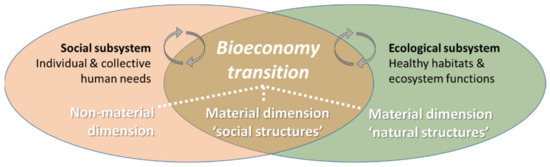 A bioeconomy transition, conceptualized as decision-making processes to fulfil (deprived) human needs with resources from the social and the ecological subsystem (elaborated on [68,80]). Arrows reflect dynamic and co-evolutionary feedback loops in the coupled SES [33,81].