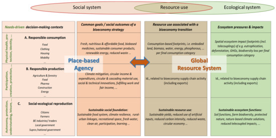 Figure 3 outlines a prototype of the place-based BIO-SES framework, distinguishing the social sub-system (in orange), the ecological sub-system (in green), as well as the (coupled) resource use activities (in brown) associated with a place-based bioeconomy transition. The prototype takes a matrix structure of the needs-driven decision-making contexts (responsible consumption, responsible production, and social-ecological reproduction) in rows, and links them to social outcomes, embodied resource use and related ecosystem impacts in columns. From left to right, the framework reads as (deprived) human needs driving decision-making towards social outcomes and ecological impacts of consumption, production and reproduction activities in the global biosphere. On the one hand, the framework has an exploratory character as it supports an (ex-ante) evaluation of ecosystem impacts as a function of consumption and (re)production strategies to strengthen the social foundation in society. On the other hand, it supports evaluative capacities of stakeholders to analyze and understand impacts of bioeconomy strategies in the global resource system.