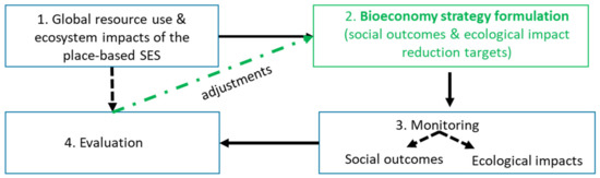 Applying the BIO-SES framework in the multi-agent, multi-sector setting requires a participatory evaluation of outcomes and impacts in an iterative adjustment process [122] (Figure 4 and Section 5). Iterative bioeconomy strategy adjustments can support the transition process towards (more) responsible consumption, production and social-ecological reproduction activities in high-income country contexts.