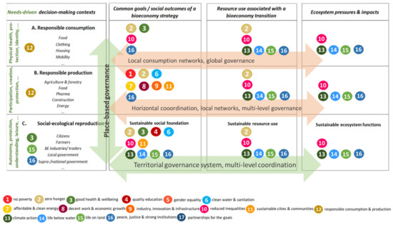 In order to strengthen the sustainability potential of a place-based bioeconomy strategy, i.e., the fulfilment of collective needs (commons) while reducing environmental pressures, we propose to align the BIO-SES framework with the UN agenda to achieve the SDGs by 2030. The other way around, framing the SDGs in the BIO-SES framework provides for normative decision-making contexts and targets aiming at solving societal problems or creating societal opportunities with a place-based bioeconomy strategy. Implementing an SDG-aligned BIO-SES framework emphasizes the role and responsibility of high income countries to act on the relation between food and non-food bioeconomy outcomes and impacts: environmental operating space for non-food bioeconomy activities to help to achieve the SDGs needs to be supported by shrinking operating space for the food-related bioeconomy in high-income country contexts. As food, and in particular animal based food, in the majority of high income countries is culturally rooted, such a transition would require measures in several policy fields, including agricultural and social policy, to coordinate a (humane) transition from livestock towards more plant and/or nature based climate solutions. Furthermore, ongoing urbanization increases the multi-facetted (governance) challenge for cities and communities to develop sustainably (SDG11), both in high and low income countries, in particular with respect to the dependency of cities on rural areas and their communities. Hence, bioeconomy transitions embody opportunities to create short, circular and sharing networks for both social and technical innovations (SDG 8, 9) at the sub-national level of society, in particular among rural and urban communities (SDG 10, 11). Similarly, efforts to frame community based bio-energy as a “common”, and make communities aware of a shared deprivation and goal (clean energy), has proven to support social innovation, investments and related spillovers to mitigate climate change in rural regions (SDG7, 13) [125].