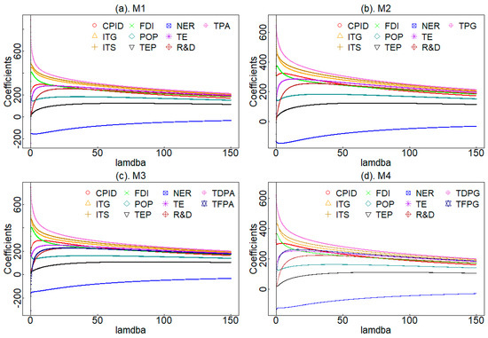 The variance inflation factors (VIFs) of the four OLS models show that all VIFs of the variables in each model are above 10, which illustrates that multicollinearity among variables is a serious issue in the OLS regression model (the results of the four OLS regressions are shown in Appendix A Table A2). We consider the standard OLS model matrix form for multiple linear regression to be , and the estimate of is given by [99]. The multicollinearity among independent variables can cause , which may lead to weak estimates [100]. Then, the estimated value of the variance matrix with the diagonal elements becomes abnormally large and instable [101]. Hoerl and Kennard [102] put forward ridge regression to reduce the standard errors by adding a degree of bias to the regression estimates, using instead of for the estimation of the coefficients of a regression model [103], where k is called the tuning/biasing/ridge parameter [104]. Since is far less than in the singular degree, the variance of the estimated value becomes narrow, forming a more stable and reliable estimated result [101]. We can see that when k = 0, the parameter estimate value is the OLS estimation [105,106,107,108]. Thus, we reran the above four models by means of ridge regression. We set the ridge regression parameter, lambda, to range from 0 to 150, and we set its step to 0.01. The ridge tracks (Figure 1) show that the coefficients of the independent variables in each model become stable when lambda is above 100.