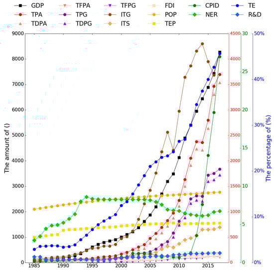 In 1978, China initiated its reform toward a market-oriented economy and started opening up to foreign trade and investment. Since then, China has achieved an “economic miracle” [1,2], with its real annual gross domestic product (GDP) at an average growth rate of 9.5% in 2018 [3]. The World Bank described China’s development as “the fastest sustained expansion by a major economy in history” [4,5]. In 1979, China’s GDP was 367.9 billion yuan (150 billion US dollars, 1.8% of the global GDP, and the 11th economy in the world). The GDP per capita was only 385 yuan (156.4 US dollars). Exports accounted for merely 0.8% of global exports of goods and services (EGS), and global foreign direct investment (FDI) was rare to none. In contrast, in 2018, its GDP had risen to 90,031 billion yuan (13,608 billion US dollars, 15.9% of the global GDP, the second-largest economy), with a per capita GDP of 59,660 yuan (9770.8 US dollars), exports accounting for 10.6% of global EGS (2655.6 billion US dollars), and FDI of 139 billion US dollars [6,7]. China has integrated into the global economy, particularly with China’s entering the WTO in 2001.