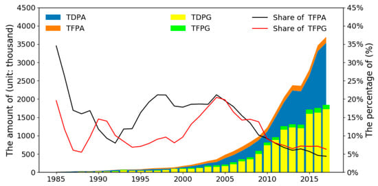 Generally, as illustrated in Figure 3, patents in China have experienced rapid growth. Total patent applications increased from 14,372 in 1985 to 3,697,845 in 2017; Total patent grants increased from 138 in 1985 to 1,836,434 in 2017. The number of both domestic and foreign patents have drastically increased. However, domestic patents increased more rapidly than foreign patents. During the period of 1996–2006, the share of Total foreign patent applications was about 20%. After that period, it gradually dropped to 4.2% in 2017. From 1992 to 2000, the share of Total foreign patent grants remained below 10%, then it increased to about 20% in 2005, and then it gradually declined to 6.3% in 2017. Conversely, the share of Total domestic patent applications and Total domestic patent grants climbed from about 80% in 2005 to 95.8% and 93.7%, respectively, in 2017.