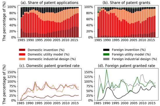 China’s Patent Law recognizes three categories of patent rights: inventions, utility models, and industrial designs. These three kinds of patents are diametrically different in nature, and they represent different technological novelties [57,109]. As Figure 4 indicates, Total foreign patent applications (in Figure 4a) and Total foreign patent grants (in Figure 4b) primarily belong to the category of inventions. The share of foreign innovation applications accounted for about 15% of the total between 1996 and 2005, but it dropped to only 4% in 2017. The share of foreign invention grants once reached 16.4% in 2004, but it declined to 6% in 2017.