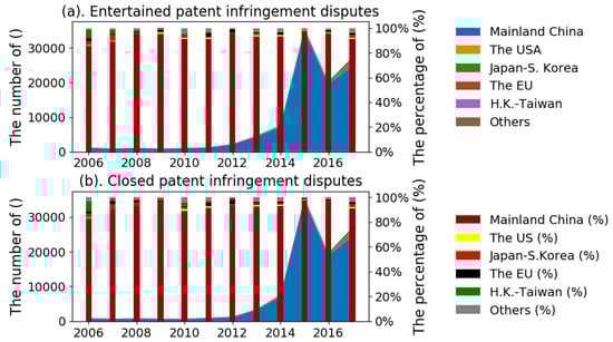 As the knowledge economy has become increasingly important, China has been ambitious in the development of an “innovation economy”, which has resulted in an increase in both patent applications and grants, as well as tighter IPR protection [14]. Conventional perceptions still hold many stereotypes about China. For example, China is notorious for its “widespread piracy” and poor ability to protect intellectual property rights, and China is thus characterized as “the world’s worst IPR infringer”. China has always been placed on the “Priority Watch List” in the annual special 301 report published by the Office of the United States Trade Representative (USTR) [15]. On 22 March 2018, the US President Donald Trump signed the Memorandum on Actions by the United States Related to the Section 301 Investigation of China’s Laws, Policies, Practices, or Actions Related to Technology Transfer, Intellectual Property, and Innovation, which stated that the US would impose tariffs on imports from China, and took actions to respond to China’s “theft of US intellectual property” [16]. After that, the Sino-US trade war inevitably broke out. The Chinese government denied the “theft” behavior. Although China has witnessed a huge rise in patent litigation in recent years, the majority of the cases are between Chinese partners [10,17]. Former American treasury secretary and economist Larry Summers also claimed that China’s technological progress was coming from “huge government investments in basic science” instead of “theft from the US” [18]. Chinese R&D expenditures formed 24% of the world’s total in 2017, up from a mere 2.6% in 1996. In 2017, R&D investments from the private sector in China accounted for 27% of the world’s total, up from only 2% in 1996 [19].