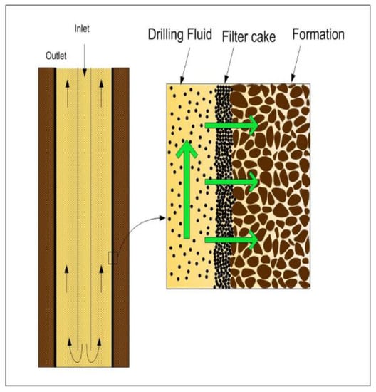 Overbalanced drilling is the most common technique for drilling oil and gas wells, where the hydrostatic pressure of the drilling fluid is kept higher than the formation pressure to prevent any production while drilling. Consequently, the drilling fluid tends to invade the formation, interacting with the solid and fluid components, causing permanent or removable formation damage. To mitigate the formation damage caused by the fluid filtrate invasion, drilling fluid formulation should be optimized by selecting the appropriate loss circulation additives that help form an ideal filter cake, thin and impermeable, on the wall of the drilled well [1,2]. Figure 1 shows a schematic of the filter cake through the wellbore. This filter cake saves the integrity of the wellbore during the drilling operation and reduces the fluid filtrate invasion [3,4,5,6]. To avoid any production restraint, the filter cake must be removed after completing drilling operations and before commencing production [7].