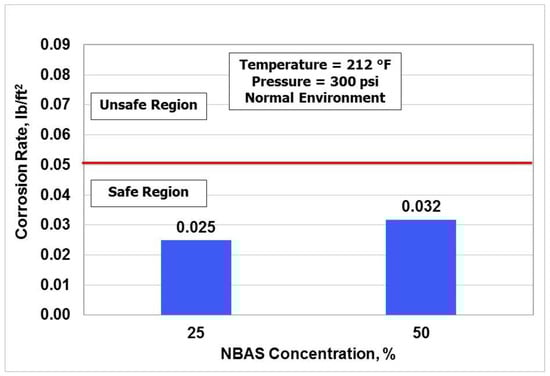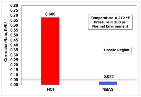 The corrosion rate was conducted at 212 °F and 300 psi applied pressure using 10 vol.% conventional HCl, and the results showed that the corrosion rate was very high and bypassed the unsafe region. Figure 5 shows that the corrosion rate using 10 vol.% HCl was 0.68 lb/ft2, which is very high compared with the corrosion rate when using 50 vol.% NBAS at the same condition.