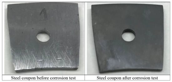 Steel coupon before and after the corrosion test using 50 vol.% of NBAS at 212 °F.