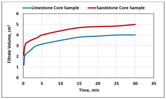Filtration tests were conducted to form the filter cake for removal tests. The drilling fluid sample was poured into a modified HPHT cell that contained two real core samples (Indiana limestone and Berea sandstone) with 2.5” diameter and around 2” length. Core samples were saturated using diesel. The filtration experiments were performed at a temperature of 212 °F and a differential pressure of 300 psi. The experiment was started, and the filtrate volume was recorded for 30 min. Figure 6 compares the filtrate volume of the invert-emulsion drilling fluid on both Indiana limestone and Berea sandstone during the filtration test. The total fluid filtrate invading the sandstone core sample was 5 cm3, while it was 4 cm3 in case of the limestone core sample. After the filtration tests, a filter cake with a thickness of 1.3 mm was formed on the sandstone core sample, while the filter cake thickness was 1 mm in case of the limestone core sample. Figure 7 shows the core samples with the resulted filter cake after the filtration test.