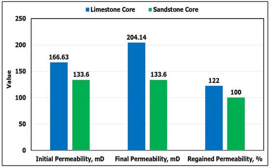 A modified HPHT filter cell was used to measure the initial and final permeability using diesel at room temperature. The final permeability of the sandstone core was 133.6 mD, which is the same value of the initial permeability, indicating the complete removal of the internal damage after the removal process, and the retained permeability was 100%. For the limestone core, the initial permeability was 166.3 mD, while the final permeability was 204.14 mD, and the retained permeability was 122.5% (Figure 9). These results confirmed that the new acid formulation was able to stimulate the limestone core sample after removing the external filter cake completely. The filtration and removal tests were conducted three times to confirm the results. Table 3 summarizes the filtration and removal test results.