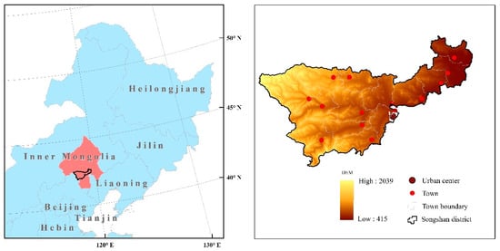 Songshan District is located south of Chifeng City, in eastern Inner Mongolia (42°01′–42°43′ N, 117°47′–119°39′ E) and has a total area of 5618 km2 []. The western part of Songshan District is mountainous; the eastern and middle parts form a plain (Figure 1). Songshan District contains 14 towns and 244 administrative villages, but we collected power consumption data from only 234 villages. The population was 591,900, with an agricultural population of 394,900 in 2017. It is an agricultural county, with a cultivated land area of 181,300 ha and 0.31 ha per capita. The district is located in key farming–pastoral areas in Northern China, and the per capita disposable income of these rural pastoral residents is generally low, reaching 12,400 yuan in 2017. With rapid urbanization, especially new urban district development, the number of resident populations in these 14 towns fell by nearly 58,000 from 2013 to 2016. Along with an increasing number of rural people migrating to urban areas, the phenomenon of hollowing villages characterized by vacant rural housing is becoming more and more serious in the Songshan District of Chifeng City.