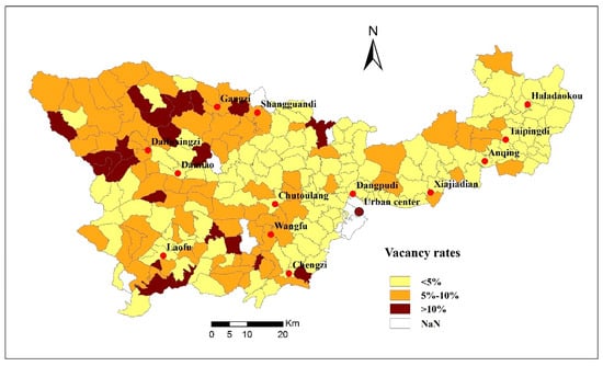 Due to rapid industrialization and urbanization, rural areas undergo significant changes in demographic structures and some experience drastic depopulation [,]. Rural dwellers, especially young adults, have poured into cities in search of more employment opportunities, higher and stable income, and better living and education standards; leaving their rural dwellings unoccupied []. Chifeng City is experiencing accelerating urbanization (49.38% in 2017). From 2008 to 2016, the rural population of Chifeng decreased by 290,200. Especially with the municipal government relocating to Songshan District, the new urban district is developing rapidly, and the housing market is blooming. Such rapid urbanization has attracted a massive influx of rural migrant workers into the cities in search of employment opportunities and has led to higher rates of housing underutilization and vacancies. An interesting finding was that that the villages around the major urban centers usually had lower vacancy rates. According to our survey, with the advantages of being located close to a central city, most peasant workers chose to stay in their home villages at night. This result echoes earlier research, in which Song, Chen and Zhang [] also showed that the rural housing vacancy rates of villages in exurbs of a central city were higher than that in the suburbs.