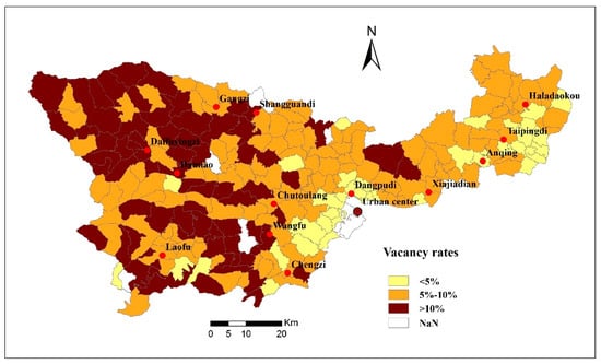 Using the annual power consumption data, we found that the average vacancy rate of rural housing of all villages in 2014 and 2017 was 5.27% and 8.69%, respectively. Figure 2 and Figure 3 shows the spatial pattern of vacancy levels in 2014 and 2017, and it indicates that the vacancy rate is much higher in the western area than the central and eastern regions. The data shows that there are significant differences between different villages. Of the 234 villages, those with high (>10%), medium (5–10%), and low (<5%) vacancy rates were 8.54%, 34.20%, and 57.26%, respectively, in 2014. For example, 10% refers to the high vacancy threshold of a village, and 8.54% of the 234 villages had vacancy rates higher than 10%. Compared with the year 2014, rural housing vacancy levels had risen significantly in 2017; those with high, medium, and low vacancy rates were 30.34%, 52.56%, and 17.09%, respectively. Specifically, there were nearly 90% villages with a vacancy rate that increased from 2014 to 2017.