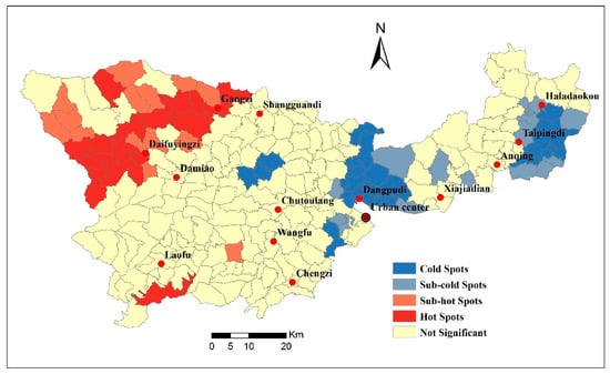 The Getis–Ord tool was used to conduct hot spot analyses to better identify the inner spatial heterogeneity of vacant rural housing. In our study, hot spots refer to clusters of high housing vacancy rates with a high z-score and p-value < 0.05, whereas cold spots refer to clusters of low housing vacancy rates with a low z-score and p-value < 0.05. The Getis–Ord is expressed as [,,,]:
