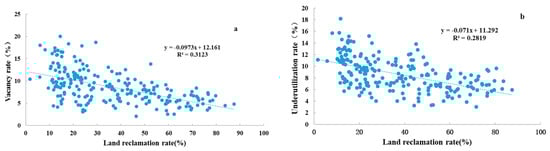 The correlation between land reclamation rate and rural housing vacancy rate (a) and underutilization rate (b) in 2017.