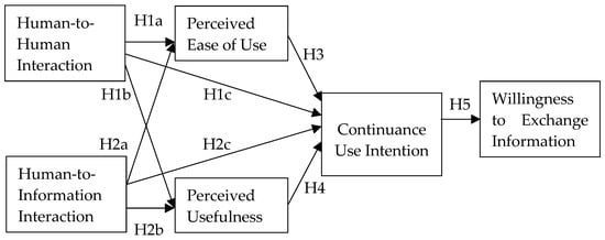 Based on the previous discussion, we formulated five major hypotheses to propose a conceptual research model (Figure 1) and tested the hypotheses in the social media environment. This model aims to identify the antecedents of users’ behavior by proposing a research model based on the technology acceptance model (TAM) theory. Perceived interactivity is involved as a prerequisite construct that together affects people’s perceived ease of use and perceived usefulness, which in turn drives their continuance use intentions to explore how it affects users’ willingness to exchange information.