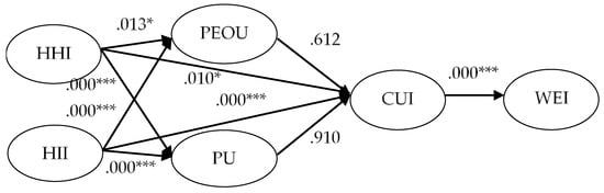 Table 5 illustrates the data after measurement of the proposed model. It can be seen that the χ2 to degrees of freedom was 2.679, CFI was 0.876 (<0.9), GFI was 0.861 (>0.8), AGFI was 0.833 (>0.8), and RMSEA was 0.067 (<0.08). The statistical analyses indicated that the proposed model had an acceptable goodness of fit (GOF).