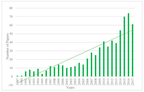 Number of articles published on fitness equipment in the Science Citation Index (SCI) and Social Science Citation Index (SSCI) from 1987 to 2017. The bars represent the number of papers published for each year, and the diagonal function defines the adjusted publication trend line emerging from the series.