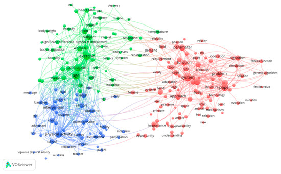 For example, the main points are the words ‘exercise’ and ‘participation’ for the green area, ‘system’ and ‘paper’ for the red area, and ‘intervention’ and ‘physical activity’ for the blue area. Following this logic, it is interesting to observe how any single usage is divided and located in each of the three research macro-areas. When researchers adopt a specific channel of investigation, this could mean a great probability that findings reveal information on these single topics, or nothing much, in relation to the closest ones.