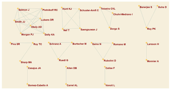 It is relevant to highlight how the top three most productive authors come from the same research group (Priority Research Centre in Physical Activity and Nutrition, University of Newcastle, Australia); they are, in descending order, Lubans, D.R.; Morgan, P.J.; and Plotnikoff, R.C. The top three most cited (TGCS) researchers are, in descending order, Trost, S.G. (Queensland University of Technology, ranked fifth in quantity production) with 579 citations for his five articles; Pate, R.R. (University of South Carolina, eighth position) with 543 citations for his four papers (these first two authors also cooperated); and Rimmer, J.H. (University of Alabama at Birmingham, fourth position) with 419 citations for his five sectoral contributions.
