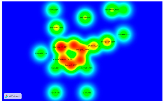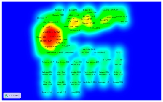 In addition to the network maps, we generated a density map of citations with VOSviewer (version 1.6.8; Nees Jan van Eck and Ludo Waltman, Leiden University, Leiden and Erasmus University, Rotterdam, Netherlands). Colors of each point in the map depended on the density of items at that specific point (i.e., red color means greater density, while blue color refers to lower density). The calculation of the density of the points on the map was calculated using the number of neighbouring items and the weight of the same using the Gaussian kernel function [28]. The larger the number of items in the neighbourhood of a point and the higher the weights of the items, the closer the colour of the point was red (conversely, a smaller amount of items and lower weights were represented with the colour blue). In those cases where the subject allowed it, the maps were depicted in areas of the institutional affiliation of each author.