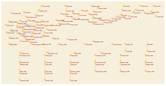 Despite the high number of authors and works assessed in the study, the citation relationships among the works are inconsistent (Figure 4). Moreover, the network comprised 70 authors (or work teams), with a single ‘major centre’ of citation represented by Gledhill [34].