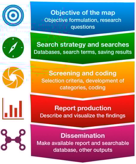 - James, K.L.; Randall, N.P.; Haddaway, N.R. A methodology for systematic mapping in environmental sciences. Environ. Evid. 2016, 5, 7. [Google Scholar] [CrossRef]