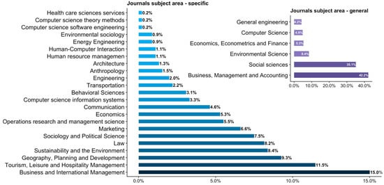 The subject areas of the journals determine the nature and type of the scientific contributions of the publications. In this study, we adopted the Scopus classification, which uses a general and a specific category to classify the journals. Concerning a general classification (right-hand side of Figure 4), journals belonging to the subject areas “business, management and accounting” (42.2%) and “social sciences” (35.1%) published more than 70% of the reviewed publications. The publications within “environmental science” and “economics, econometrics and finance”, “computer science”, and “general engineering” account for 8.4%, 5.3%, 4.8%, and 4.2%, respectively.