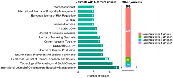 Remarkably, two hundred eighty-four (284) different journals published the 453 journal articles reviewed, 15 journals published between five and 13 publications each, and 221 journals issued a single article about the topic. The International Journal of Contemporary Hospitality Management was the top with 13 articles, followed by the Technological Forecasting and Social Change (11 articles) and the Cambridge Journal of Regions, Economy and Society (10 articles), Environmental Innovation and Societal Transitions (8 articles), Journal of Cleaner Production (8 articles), and Sustainability (8 articles). See Figure 5 for a complete overview of the number of articles published in diverse journals.