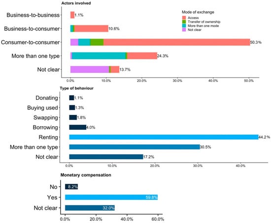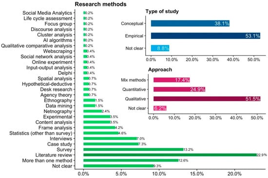 Shared space (21.4%) and shared mobility (18.1%) are the two main focuses of the majority of the publications. Some of the publications analyzed more than one sectors (15.4%), whereas 34.8% do not specify the sector of application (generic context). The predominant focus of these latter publications was on conceptualization and discourses about the modern sharing phenomenon in general terms. The remaining publications (10.5%) were about other intangible assets (3.1%), food (2.6%), other tangible assets (2.6%), finance (0.7%), and other sectors (1.3%). Table 4 shows the detailed percentage distribution within each business sector. Except for food and finance that refer only to one specific sector (i.e., meal sharing and crowdfunding), the other sectors embed various subsectors. Space contains shared accommodation (19.8%), coworking office (0.9%), and land sharing (0.7%); mobility divides car sharing (17.2%) and bike sharing (0.4%); other intangible assets covers crowdwork (2%), time banking (0.7%), and energy (0.4%); other tangible assets holds clothing (2.2%), books (0.2%), and furniture (0.2%); finally, other sectors entails digital manufacturing (0.7%), customs broker (0.2%), journalism (0.2%), and healthcare (0.2%). Hence, shared accommodation and car sharing result to be the main contexts of research application; on the contrary, scarce focus has been employed to other subsectors of space and mobility, such as coworking office and bike sharing, finance, food, other tangible assets, and other intangible assets.