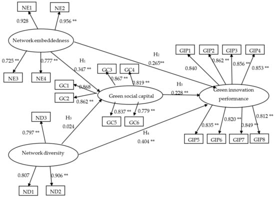 We refer to other research to design questionnaire items. We employ two pretests to revise the questionnaire before mailing questionnaires to respondents. Therefore, the measurement of this study is acceptable in terms content validity. Moreover, several measures confirm the reliability and validity of the measurement. One measure of reliability is the loading of each construct’s individual items. With respect to the quality of the measurement model, the loadings (λ) of all items of the four constructs that are listed in Table 3 are significant. Cronbach’s α is another measure of reliability. Table 4 lists Cronbach’s α for the four constructs. In general, the minimum Cronbach’s α coefficient indicating reliability is 0.7 [73]. In Table 4, the Cronbach’s α coefficient of network embeddedness is 0.919; that of network diversity is 0.870; that of green social capital is 0.942; and, that of green innovation performance is 0.953. The reliability of the measurement in this study is acceptable, as the Cronbach’s α coefficient for all constructs are more than 0.7. In addition, the convergent validity of the construct is acceptable if the AVE of a construct is higher than 0.5. As presented in Table 3, the AVEs of the four constructs are 0.726, 0.702, 0.704, and 0.707, which are all higher than 0.5. This indicates that the convergent validity of the measurement is acceptable. The reliability and validity of the measurement in this study are acceptable based on the aforementioned results.