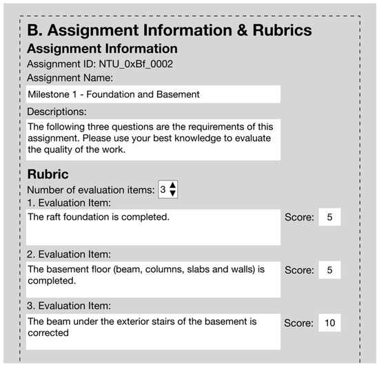 - Develop assessment rubrics: The instructor should develop rubrics for each sub-task for the learner to use as the assessment guidelines when reviewing others’ work. These rubrics should follow the set milestones for each sub-task. In BIM tool learning, it is important to make the learner aware of potential mistakes that they may make. Therefore, this research suggests that the rubrics can be developed using a binary checklist. The instructor should list the critical parts of each milestone and let the learner take a close look at others’ models. Additionally, unlike in architectural design or the composition of an article, evaluating the BIM tool learning performance of peers contains few subjective elements. A binary checklist could also make the peer review rubrics more objective, thus facilitating the learner’s implementation of the assessment. For instance, instead of the question, “Do you think the model of the wall is well built with the approximate information attached?” the question should be phrased as “Is the wall built to the right scale and in the right position?” or “Is the window installed in the right place according to the shop drawing?”