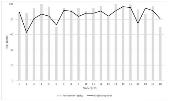 At the end of the semester, results from the 32 students were filtered for analysis; only 20 remained after removal of the students who either failed to complete the peer review or quit the course during the semester. For effective evaluations, this research compared the assignment scores of the peer review results with the instructor’s grades (Figure 7). Figure 7 illustrates the grades of the peer reviews (bars) with those of the instructor (line) for the 20 students.