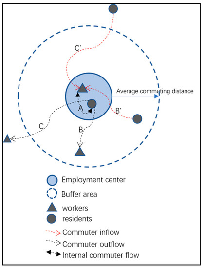 According to the co-location hypothesis, a better jobs-housing balance can be achieved by the mutual local adjustment between jobs and housing [18], but most indicators that empirical studies used cannot specifically measure how balanced the resident workers have access to jobs within ‘reasonable’ travel distance or time, such as self-containment indexes [17], commuting distance, and commuting time. For example, the study of Schwanen et al. [27] shows that workers in polycentric cities with decentralized commuting and exchange commuting spend more time commuting to and from work than those in monocentric and cross-commuting polycentric cities. Therefore, different types of polycentric urban systems lead to insignificant differences in commuting distance, and thus commuting distance cannot fully reflect the jobs-housing matching of employment centers. Therefore, based on the users’ residence and workplace data of base station locations that were identified from cellphone signaling data, this study constructs a jobs-housing matching index from the perspective of commuter connection. Ewing [34] believes that a jobs-housing matched community must achieve a certain internal commuting rate within a reasonable commuting range, and Peng [35] believed that the average or median of the actual commuting distance should be regarded as a reasonable commuting distance. Therefore, we take the commuting rate within the average commuting radius of employment centers as an index of which to judge jobs-housing matching, as shown in Figure 1. Drawing a buffer zone that is based on the average commuting distance along the employment center boundary, the residential jobs-housing matching index is (A+B)/(A+B+C), and the workers’ jobs-housing index is (A+B’)/(A+B’+C’). If the jobs-housing matching index exceeds a certain threshold value (such as the average value of all the centers), then the center is considered as reflecting jobs-housing matching; otherwise, it is a jobs-housing mismatch.