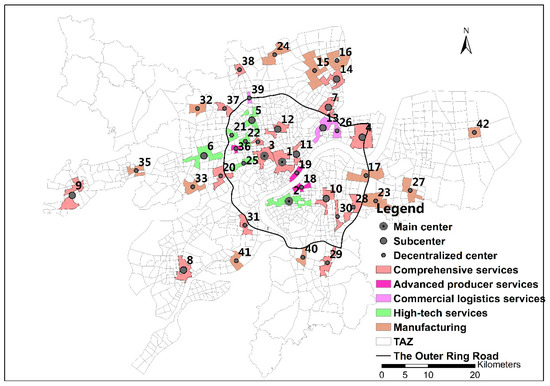 Sub-center: The total employment population is more than 20,000, the average employment density is more than 2000 persons/km2, and employment density of at least one-unit is more than 4000 persons/km2. Eleven sub-centers were identified.
