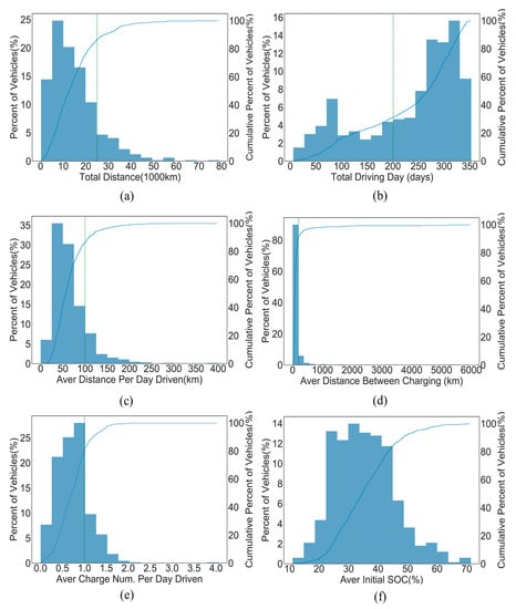 Distribution of the six metrics at the vehicle level:(a) Total distance (b) Total driving day (c) Aver distance per day driven (d) Aver distance between charging (e) Aver charge num. per day driven (f) Aver initial SOC.