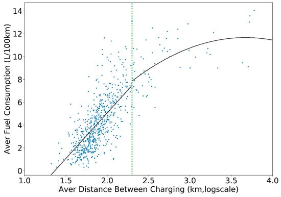 An average 91% of the PHEVs were charged after driven less than 200 km, indicating that the supply of charging station in Shanghai can meet the charging demand of PHEV users but could still be improved. Pearson correlation analysis () indicates that there is a positive significant correlation between the average distance between charging and the average fuel consumption. As shown in Figure 5, the curve fit indicates there is a strong linear relationship between them when the average distance between charging is less than 200 km, while there is a quadrative curve and the average fuel consumption maintains at a higher interval when the average distance between charging exceeds 200 km.