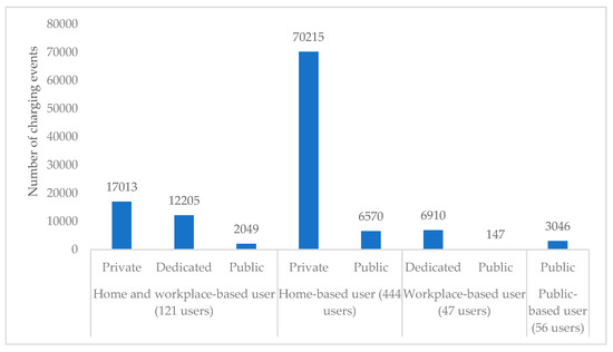 Having matched charging locations and charging stations, we have a clear understanding of whether PHEV users charge at home or workplace and how many charging location choices a PHEV user has. The number of charging in the private, workplace, and public stations/points were figured out as 87,228, 19,115, and 11,812, respectively. The results also provide insights into the drivers’ charging behavior as follows: