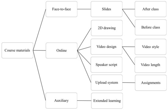 The last step of the course development and material preparation is to prepare the course material according to the pre-defined subsections. Appropriate course materials can help students to learn independently and even provide motivation for learning. As a project-based online course, the course materials contain three major parts: face-to-face lecture, online materials, and auxiliary information (Figure 3).