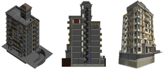 The course project selected for this BIM class is a 7-floor residence from the Skill Evaluation Center in Taiwan, as shown in Figure 4. The structure of this building contains basic components such as columns, beams, plates, and walls, as well as styling balconies, parapet walls, foundations, etc. In addition to the structure, it also contains infrastructure, doors, windows, furniture, kitchen equipment, sloping roof shapes, garages, etc. Students are able to fully practice all of the basic BIM components with this fairly complete residential project. The completed project model will be applied to the follow-up course of collision checking, animation configuration, and planning/scheduling.